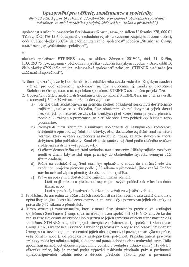 Důležité oznámení - Upozornění pro věřitele, zaměstnance a společníky